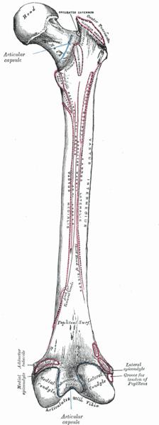 広筋(大腿直筋を除いた残り3つの大腿四頭筋)は、大腿骨骨幹部が起始部で、大殿筋は骨幹部後部・側部が停止部です。大腿骨の長さは、膝と股関節のモーメントアームに大きく影響します。