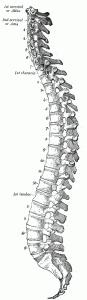 脊柱は頭の付け根から骨盤上部まで繋がっていて、24個の脊椎骨から構成されています。その脊椎骨は、3種類に分類されます。首に7個の頸椎、首の付け根から肋骨の下部までに12個の胸椎、肋骨下部から骨盤上部までに5個の腰椎が存在しています。