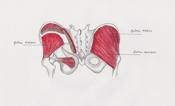 大殿筋は最も強い股関節伸展筋です。腸骨の後部から起始し、大腿骨の後・側部と腸脛靭帯に付着しています(脚の側面に位置する非常に太い結合組織)。