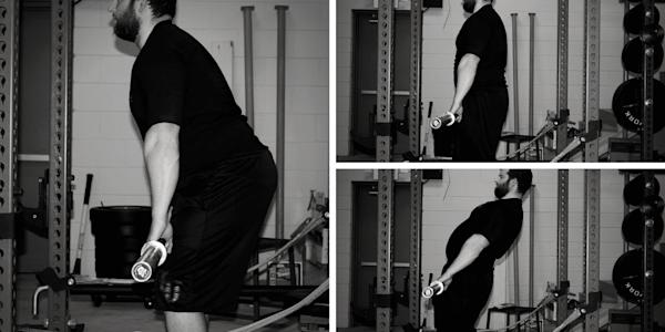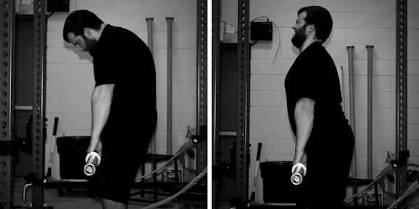 胸を張って、少しだけ膝を曲げて、お尻を後ろに突き出しましょう。これを数セット5〜10レップ行います。18〜23kg程度で問題なく行えるようになったら、次のステップに移行します。