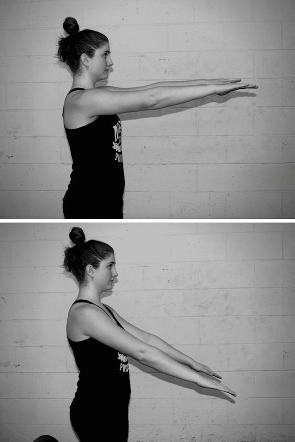 1b. 荷重するため、軽量のダンベルやケトルベルを持って、胸骨の前に保持します。その状態で1aのドリルを行ってください。2セット5〜10レップ程度行いましょう。簡単に行えるべきです。